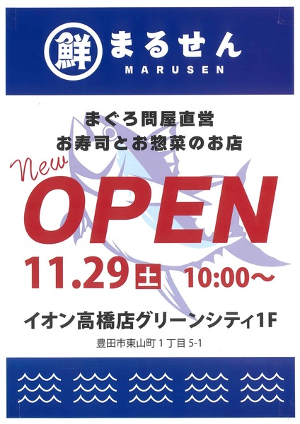※このサイトの推奨フォントは「中」です ※ページが更新されない場合は履歴のクリアをお試しください。 まぐろ問屋直営 お寿司とお惣菜のお店 『まるせん』 11月29日(土) OPEN!!